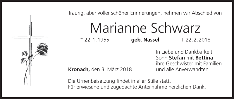 Hier finden Sie alle Traueranzeigen aus der Zeitung, die bisher für Marianne Schwarz erschienen sind. Weitere Traueranzeigen, die in der Zeitung erscheinen, werden hier ebenfalls aufgelistet