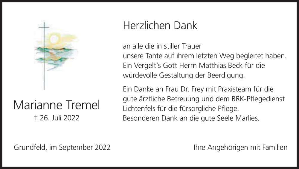 Hier finden Sie alle Traueranzeigen aus der Zeitung, die bisher für Marianne Tremel erschienen sind. Weitere Traueranzeigen, die in der Zeitung erscheinen, werden hier ebenfalls aufgelistet