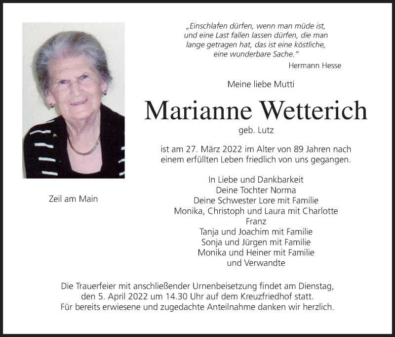 Hier finden Sie alle Traueranzeigen aus der Zeitung, die bisher für Marianne Wetterich erschienen sind. Weitere Traueranzeigen, die in der Zeitung erscheinen, werden hier ebenfalls aufgelistet