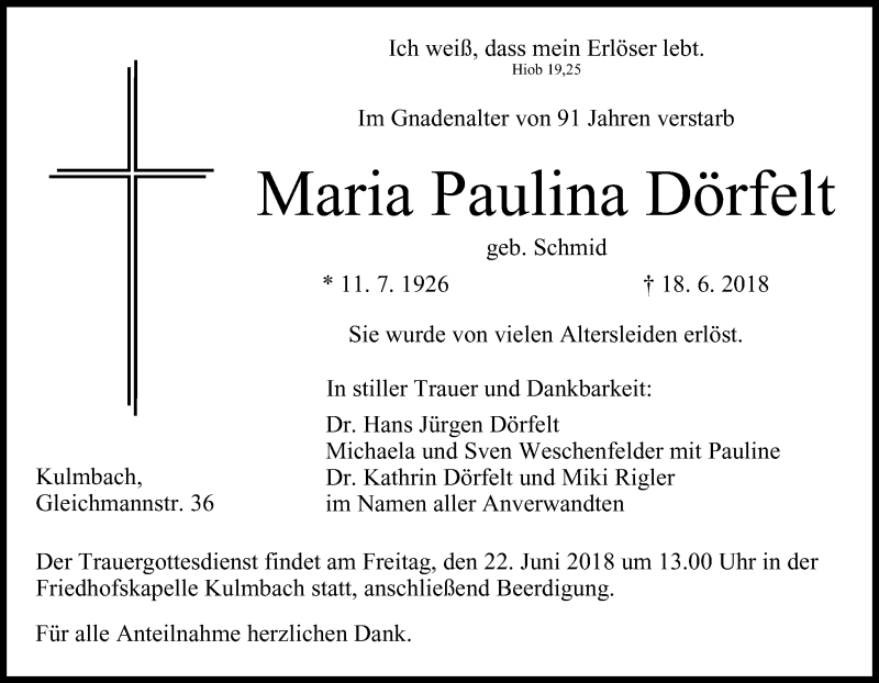 Hier finden Sie alle Traueranzeigen aus der Zeitung, die bisher für Maria Paulina Dörfelt erschienen sind. Weitere Traueranzeigen, die in der Zeitung erscheinen, werden hier ebenfalls aufgelistet