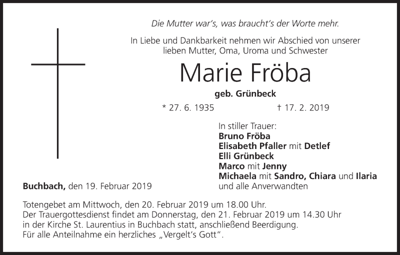 Hier finden Sie alle Traueranzeigen aus der Zeitung, die bisher für Marie Fröba erschienen sind. Weitere Traueranzeigen, die in der Zeitung erscheinen, werden hier ebenfalls aufgelistet