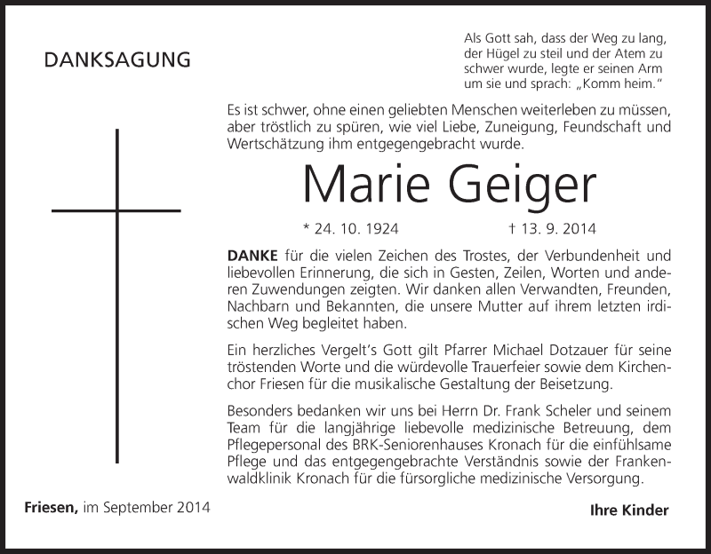 Hier finden Sie alle Traueranzeigen aus der Zeitung, die bisher für Marie Geiger erschienen sind. Weitere Traueranzeigen, die in der Zeitung erscheinen, werden hier ebenfalls aufgelistet