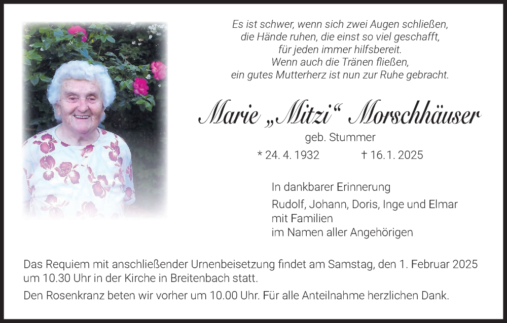 Hier finden Sie alle Traueranzeigen aus der Zeitung, die bisher für Marie Morschhäuser erschienen sind. Weitere Traueranzeigen, die in der Zeitung erscheinen, werden hier ebenfalls aufgelistet
