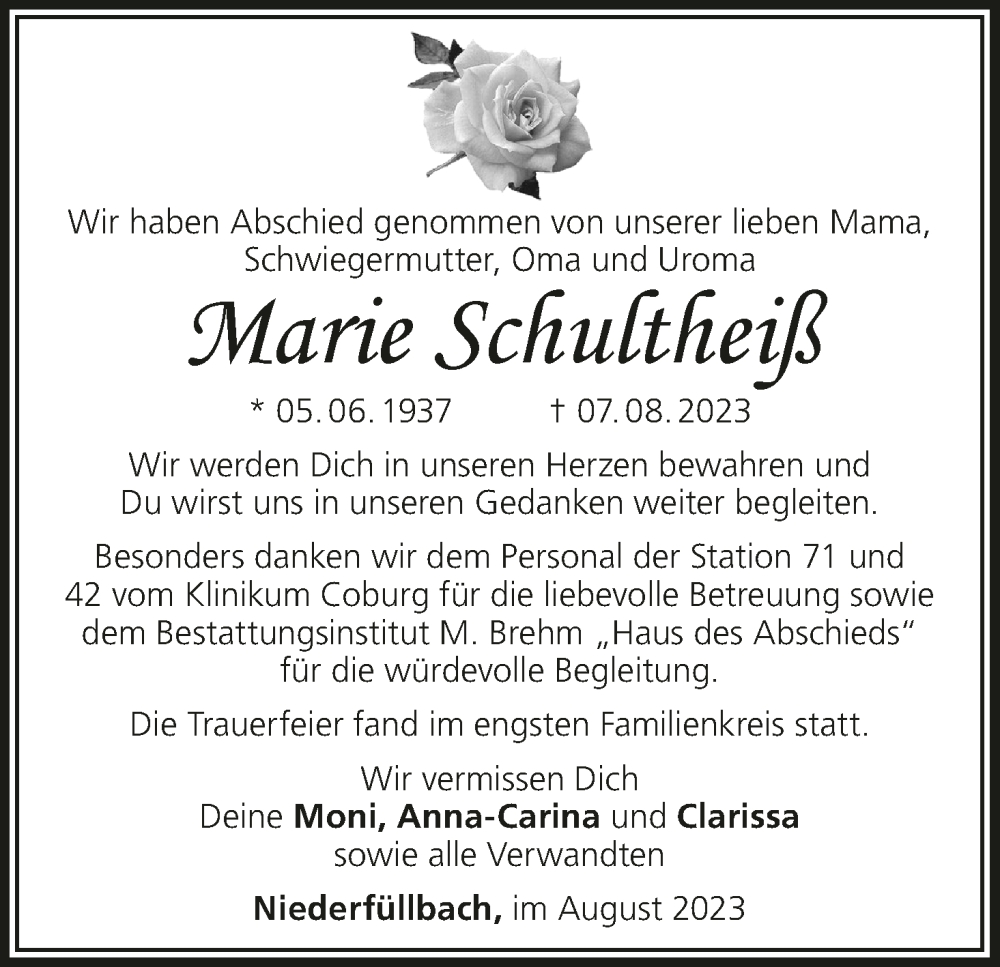 Hier finden Sie alle Traueranzeigen aus der Zeitung, die bisher für Marie Schultheiß erschienen sind. Weitere Traueranzeigen, die in der Zeitung erscheinen, werden hier ebenfalls aufgelistet