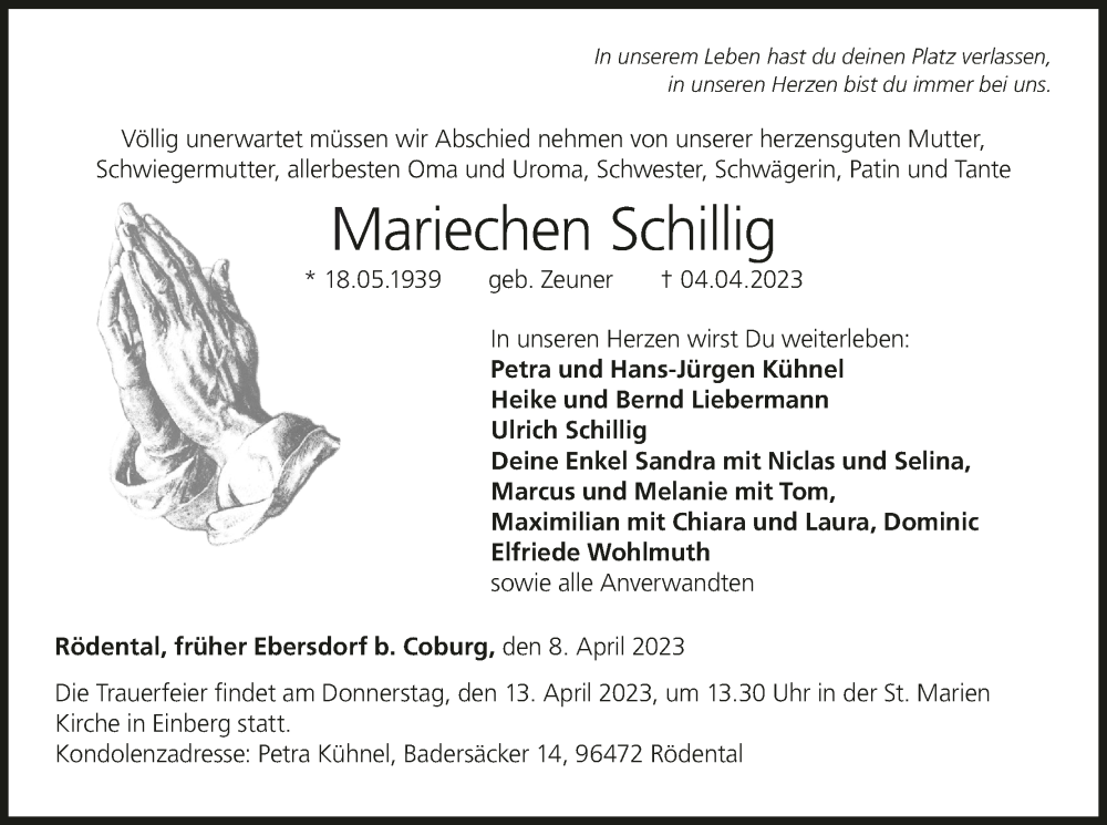 Hier finden Sie alle Traueranzeigen aus der Zeitung, die bisher für Mariechen Schillig erschienen sind. Weitere Traueranzeigen, die in der Zeitung erscheinen, werden hier ebenfalls aufgelistet