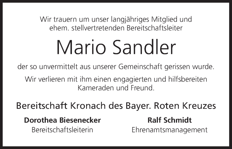 Hier finden Sie alle Traueranzeigen aus der Zeitung, die bisher für Mario Sandler erschienen sind. Weitere Traueranzeigen, die in der Zeitung erscheinen, werden hier ebenfalls aufgelistet