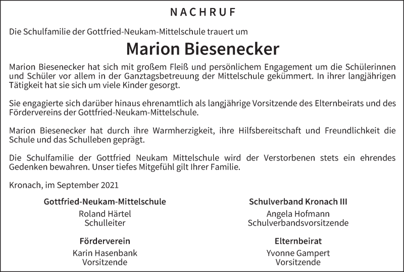 Hier finden Sie alle Traueranzeigen aus der Zeitung, die bisher für Marion Biesenecker erschienen sind. Weitere Traueranzeigen, die in der Zeitung erscheinen, werden hier ebenfalls aufgelistet