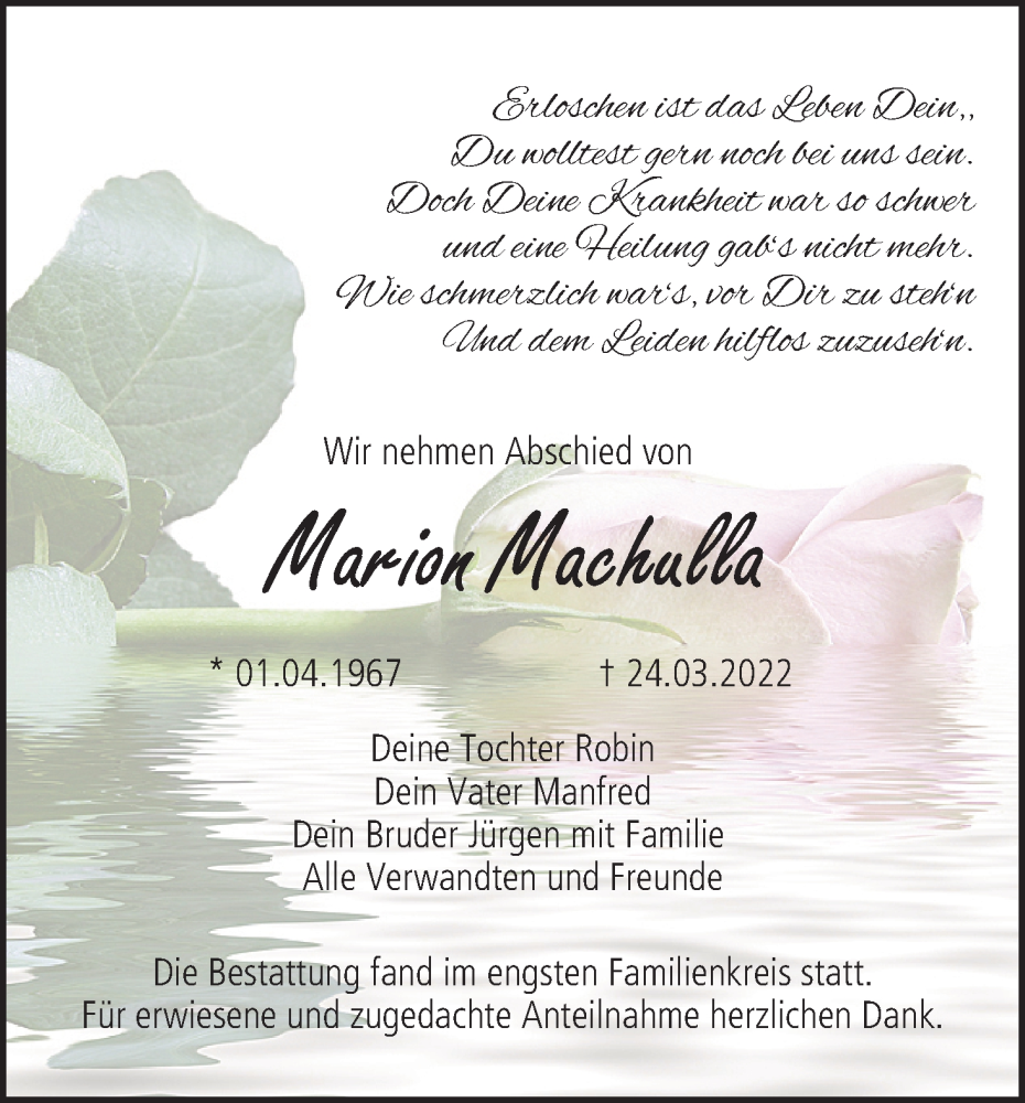 Hier finden Sie alle Traueranzeigen aus der Zeitung, die bisher für Marion Machulla erschienen sind. Weitere Traueranzeigen, die in der Zeitung erscheinen, werden hier ebenfalls aufgelistet