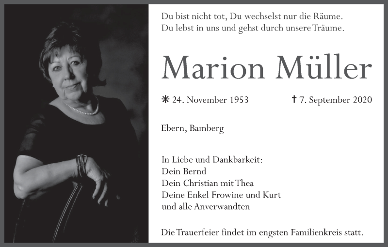Hier finden Sie alle Traueranzeigen aus der Zeitung, die bisher für Marion Müller erschienen sind. Weitere Traueranzeigen, die in der Zeitung erscheinen, werden hier ebenfalls aufgelistet