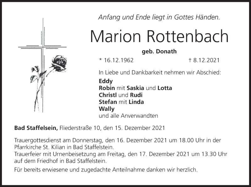 Hier finden Sie alle Traueranzeigen aus der Zeitung, die bisher für Marion Rottenbach erschienen sind. Weitere Traueranzeigen, die in der Zeitung erscheinen, werden hier ebenfalls aufgelistet