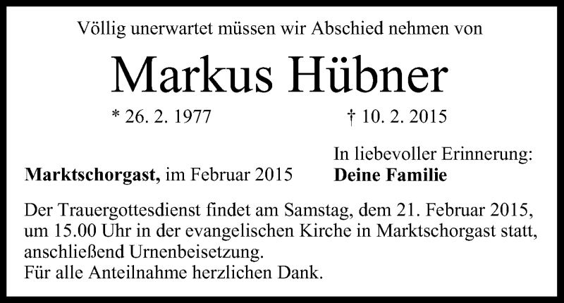 Hier finden Sie alle Traueranzeigen aus der Zeitung, die bisher für Markus Hübner erschienen sind. Weitere Traueranzeigen, die in der Zeitung erscheinen, werden hier ebenfalls aufgelistet