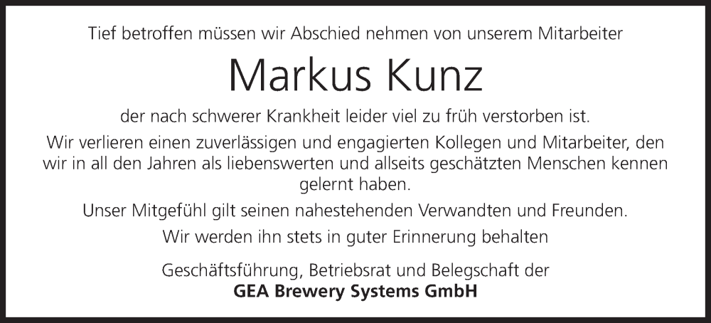 Hier finden Sie alle Traueranzeigen aus der Zeitung, die bisher für Markus Kunz erschienen sind. Weitere Traueranzeigen, die in der Zeitung erscheinen, werden hier ebenfalls aufgelistet