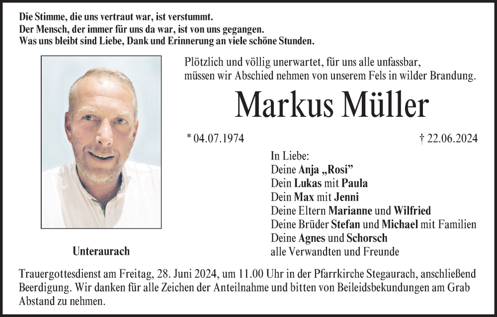 Hier finden Sie alle Traueranzeigen aus der Zeitung, die bisher für Markus Müller erschienen sind. Weitere Traueranzeigen, die in der Zeitung erscheinen, werden hier ebenfalls aufgelistet