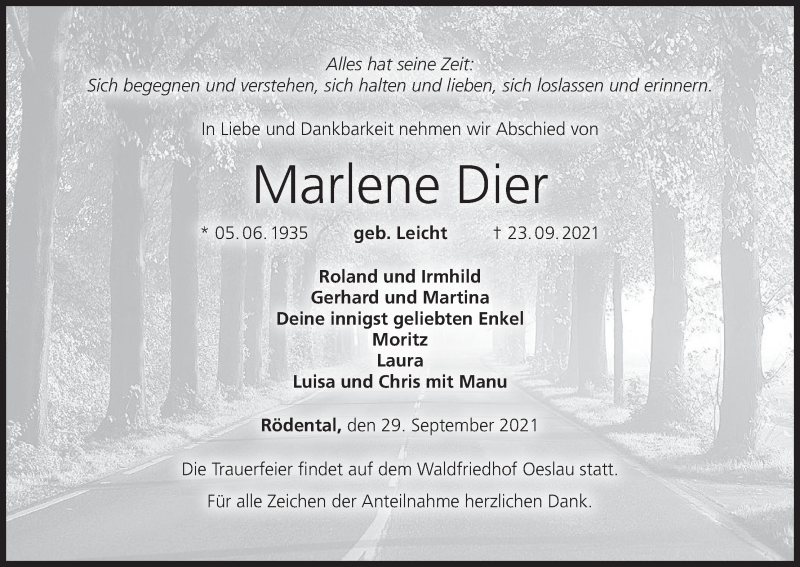 Hier finden Sie alle Traueranzeigen aus der Zeitung, die bisher für Marlene Dier erschienen sind. Weitere Traueranzeigen, die in der Zeitung erscheinen, werden hier ebenfalls aufgelistet