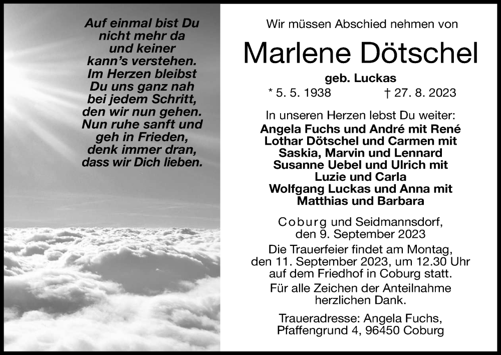 Hier finden Sie alle Traueranzeigen aus der Zeitung, die bisher für Marlene Dötschel erschienen sind. Weitere Traueranzeigen, die in der Zeitung erscheinen, werden hier ebenfalls aufgelistet