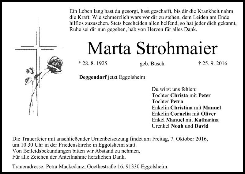Hier finden Sie alle Traueranzeigen aus der Zeitung, die bisher für Marta Strohmaier erschienen sind. Weitere Traueranzeigen, die in der Zeitung erscheinen, werden hier ebenfalls aufgelistet
