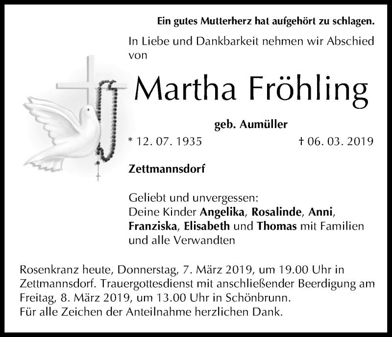 Hier finden Sie alle Traueranzeigen aus der Zeitung, die bisher für Martha Fröhling erschienen sind. Weitere Traueranzeigen, die in der Zeitung erscheinen, werden hier ebenfalls aufgelistet