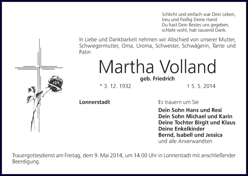 Hier finden Sie alle Traueranzeigen aus der Zeitung, die bisher für Martha Volland erschienen sind. Weitere Traueranzeigen, die in der Zeitung erscheinen, werden hier ebenfalls aufgelistet