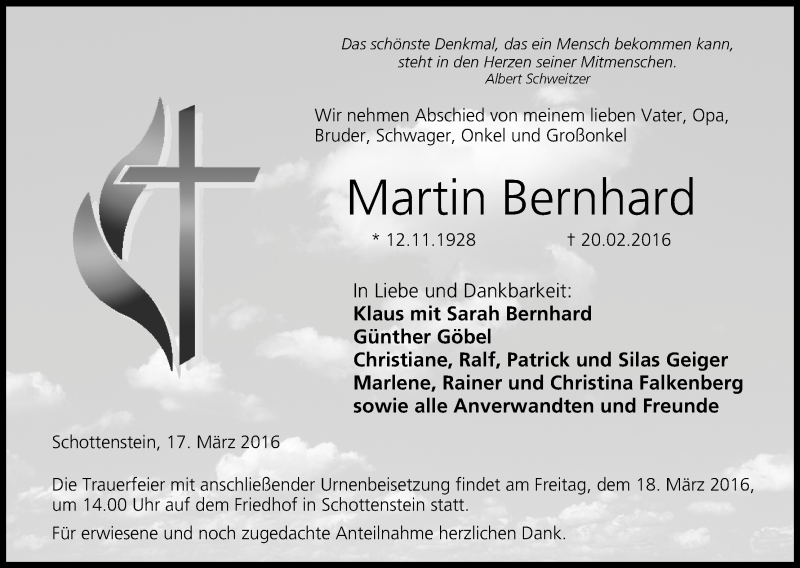 Hier finden Sie alle Traueranzeigen aus der Zeitung, die bisher für Martin Bernhard erschienen sind. Weitere Traueranzeigen, die in der Zeitung erscheinen, werden hier ebenfalls aufgelistet