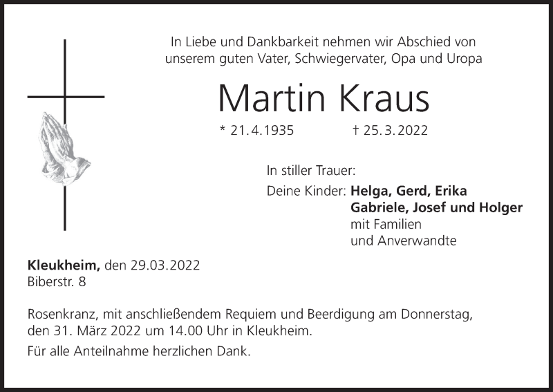 Hier finden Sie alle Traueranzeigen aus der Zeitung, die bisher für Martin Kraus erschienen sind. Weitere Traueranzeigen, die in der Zeitung erscheinen, werden hier ebenfalls aufgelistet