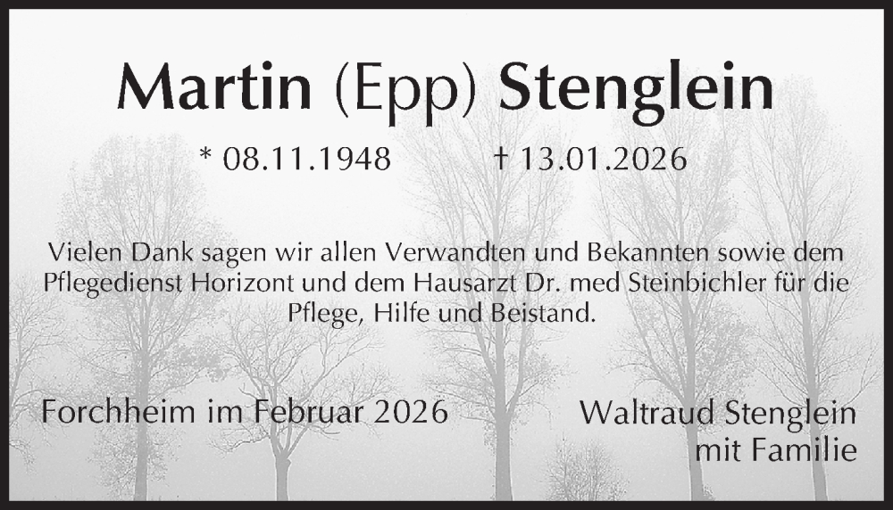 Hier finden Sie alle Traueranzeigen aus der Zeitung, die bisher für Martin Stenglein erschienen sind. Weitere Traueranzeigen, die in der Zeitung erscheinen, werden hier ebenfalls aufgelistet