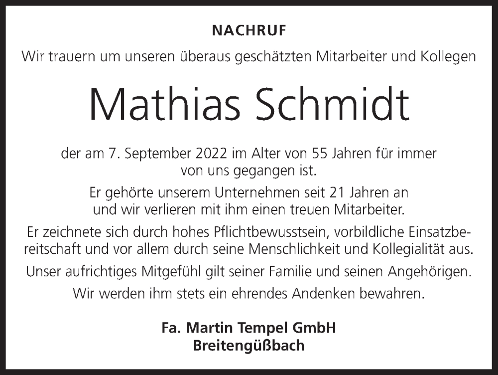 Hier finden Sie alle Traueranzeigen aus der Zeitung, die bisher für Mathias Schmidt erschienen sind. Weitere Traueranzeigen, die in der Zeitung erscheinen, werden hier ebenfalls aufgelistet