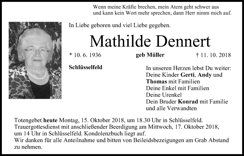 Hier finden Sie alle Traueranzeigen aus der Zeitung, die bisher für Mathilde Dennert erschienen sind. Weitere Traueranzeigen, die in der Zeitung erscheinen, werden hier ebenfalls aufgelistet