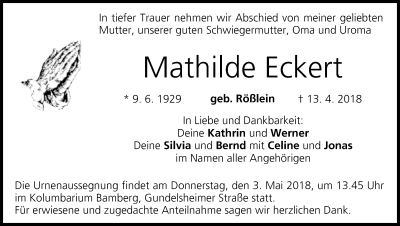 Hier finden Sie alle Traueranzeigen aus der Zeitung, die bisher für Mathilde Eckert erschienen sind. Weitere Traueranzeigen, die in der Zeitung erscheinen, werden hier ebenfalls aufgelistet