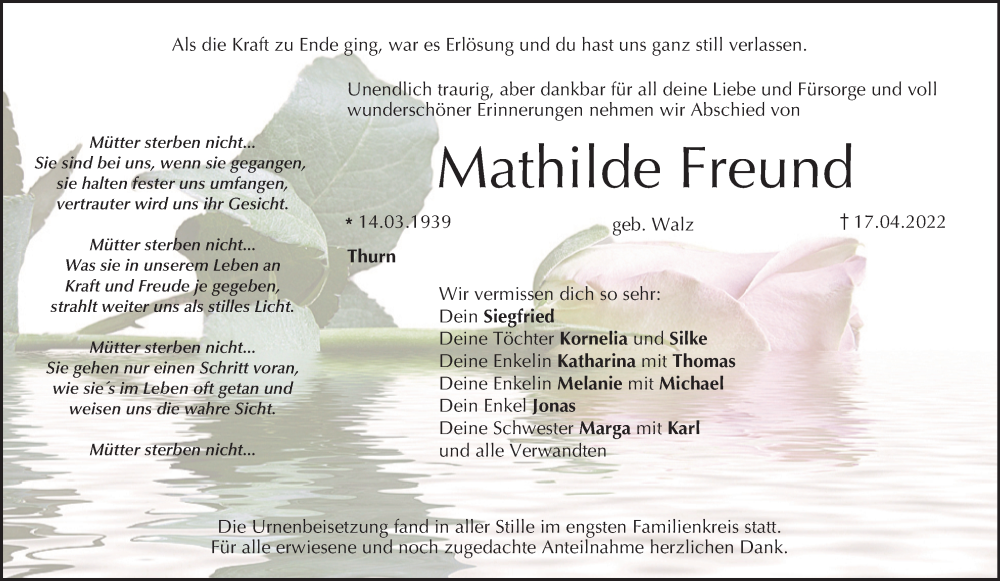 Hier finden Sie alle Traueranzeigen aus der Zeitung, die bisher für Mathilde Freund erschienen sind. Weitere Traueranzeigen, die in der Zeitung erscheinen, werden hier ebenfalls aufgelistet