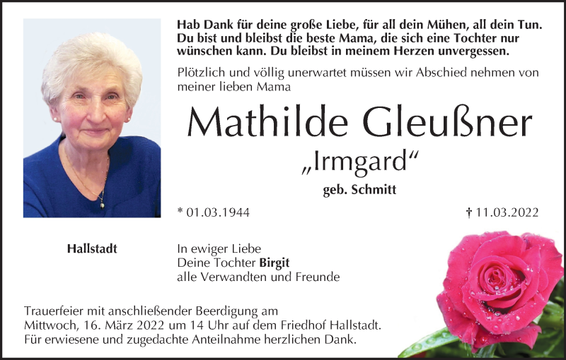 Hier finden Sie alle Traueranzeigen aus der Zeitung, die bisher für Mathilde Gleußner erschienen sind. Weitere Traueranzeigen, die in der Zeitung erscheinen, werden hier ebenfalls aufgelistet