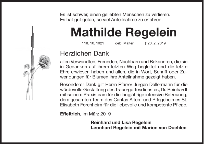 Hier finden Sie alle Traueranzeigen aus der Zeitung, die bisher für Mathilde Regelein erschienen sind. Weitere Traueranzeigen, die in der Zeitung erscheinen, werden hier ebenfalls aufgelistet