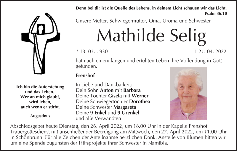 Hier finden Sie alle Traueranzeigen aus der Zeitung, die bisher für Mathilde Selig erschienen sind. Weitere Traueranzeigen, die in der Zeitung erscheinen, werden hier ebenfalls aufgelistet