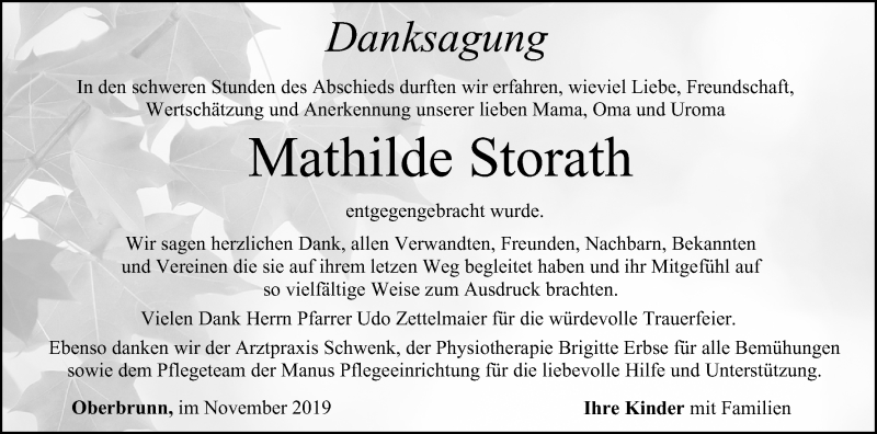 Hier finden Sie alle Traueranzeigen aus der Zeitung, die bisher für Mathilde Storath erschienen sind. Weitere Traueranzeigen, die in der Zeitung erscheinen, werden hier ebenfalls aufgelistet