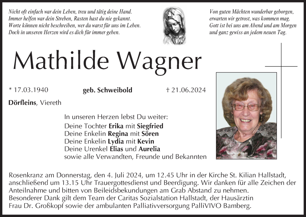 Hier finden Sie alle Traueranzeigen aus der Zeitung, die bisher für Mathilde Wagner erschienen sind. Weitere Traueranzeigen, die in der Zeitung erscheinen, werden hier ebenfalls aufgelistet