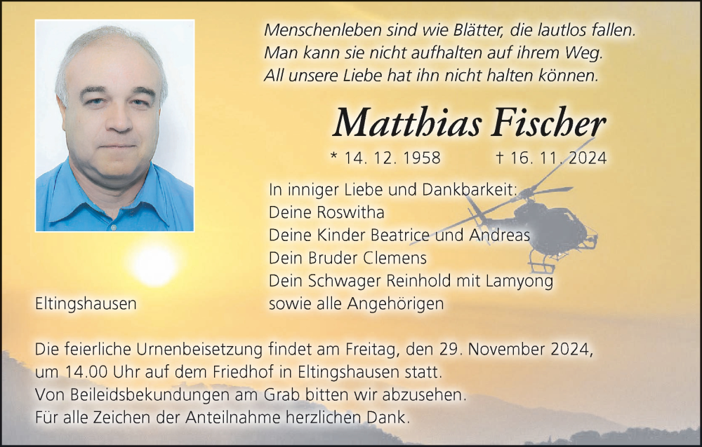 Hier finden Sie alle Traueranzeigen aus der Zeitung, die bisher für Matthias Fischer erschienen sind. Weitere Traueranzeigen, die in der Zeitung erscheinen, werden hier ebenfalls aufgelistet