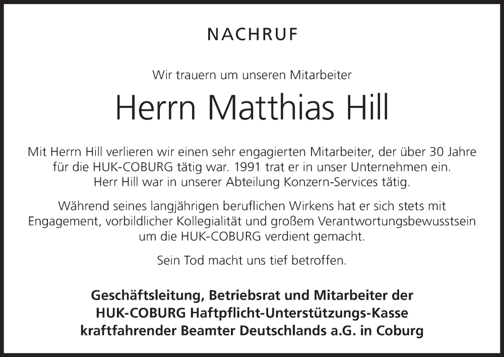 Hier finden Sie alle Traueranzeigen aus der Zeitung, die bisher für Matthias Hill erschienen sind. Weitere Traueranzeigen, die in der Zeitung erscheinen, werden hier ebenfalls aufgelistet