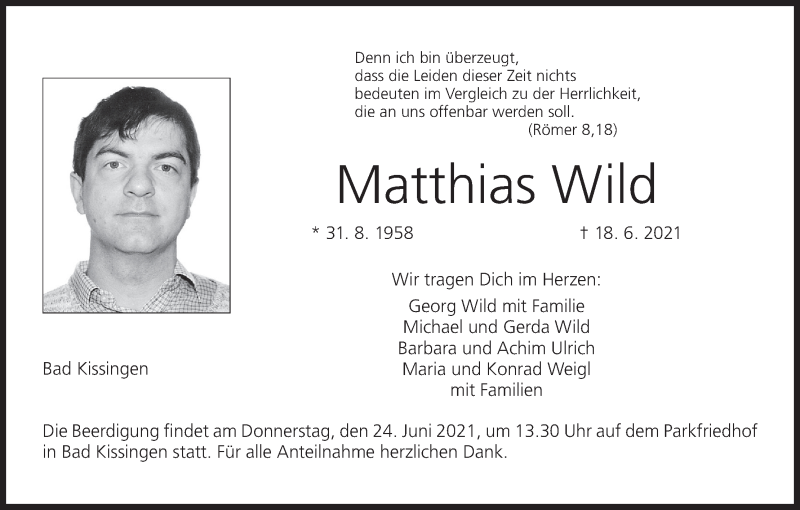 Hier finden Sie alle Traueranzeigen aus der Zeitung, die bisher für Matthias Wild erschienen sind. Weitere Traueranzeigen, die in der Zeitung erscheinen, werden hier ebenfalls aufgelistet
