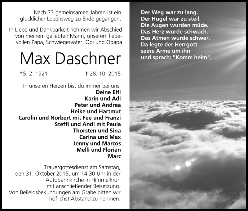 Hier finden Sie alle Traueranzeigen aus der Zeitung, die bisher für Max Daschner erschienen sind. Weitere Traueranzeigen, die in der Zeitung erscheinen, werden hier ebenfalls aufgelistet