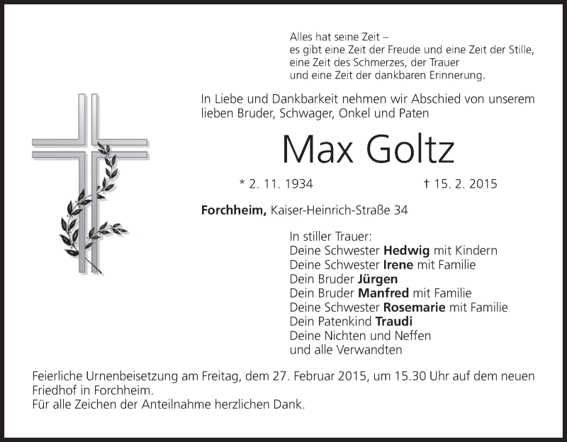 Hier finden Sie alle Traueranzeigen aus der Zeitung, die bisher für Max Goltz erschienen sind. Weitere Traueranzeigen, die in der Zeitung erscheinen, werden hier ebenfalls aufgelistet