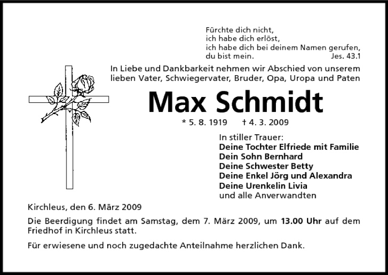 Hier finden Sie alle Traueranzeigen aus der Zeitung, die bisher für Max Schmidt erschienen sind. Weitere Traueranzeigen, die in der Zeitung erscheinen, werden hier ebenfalls aufgelistet
