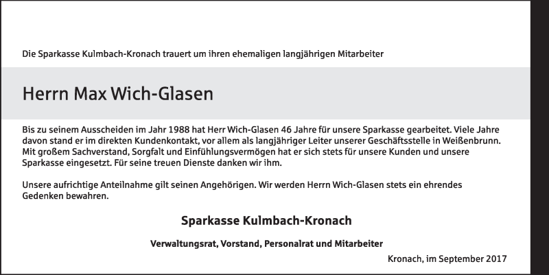 Hier finden Sie alle Traueranzeigen aus der Zeitung, die bisher für Max Wich-Glasen erschienen sind. Weitere Traueranzeigen, die in der Zeitung erscheinen, werden hier ebenfalls aufgelistet