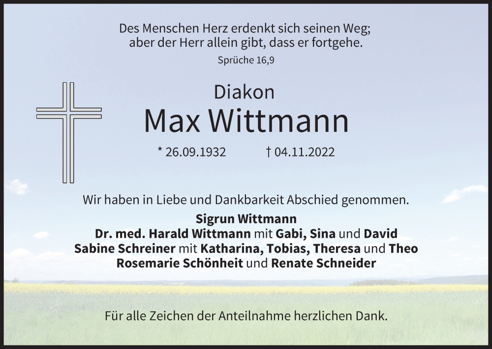 Hier finden Sie alle Traueranzeigen aus der Zeitung, die bisher für Max Wittmann erschienen sind. Weitere Traueranzeigen, die in der Zeitung erscheinen, werden hier ebenfalls aufgelistet