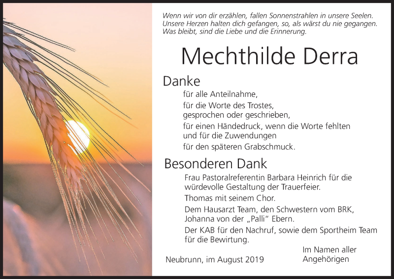 Hier finden Sie alle Traueranzeigen aus der Zeitung, die bisher für Mechthilde Derra erschienen sind. Weitere Traueranzeigen, die in der Zeitung erscheinen, werden hier ebenfalls aufgelistet