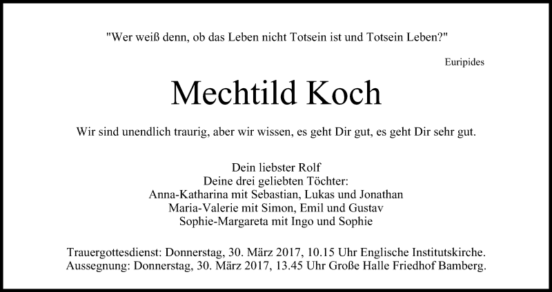 Hier finden Sie alle Traueranzeigen aus der Zeitung, die bisher für Mechtild Koch erschienen sind. Weitere Traueranzeigen, die in der Zeitung erscheinen, werden hier ebenfalls aufgelistet