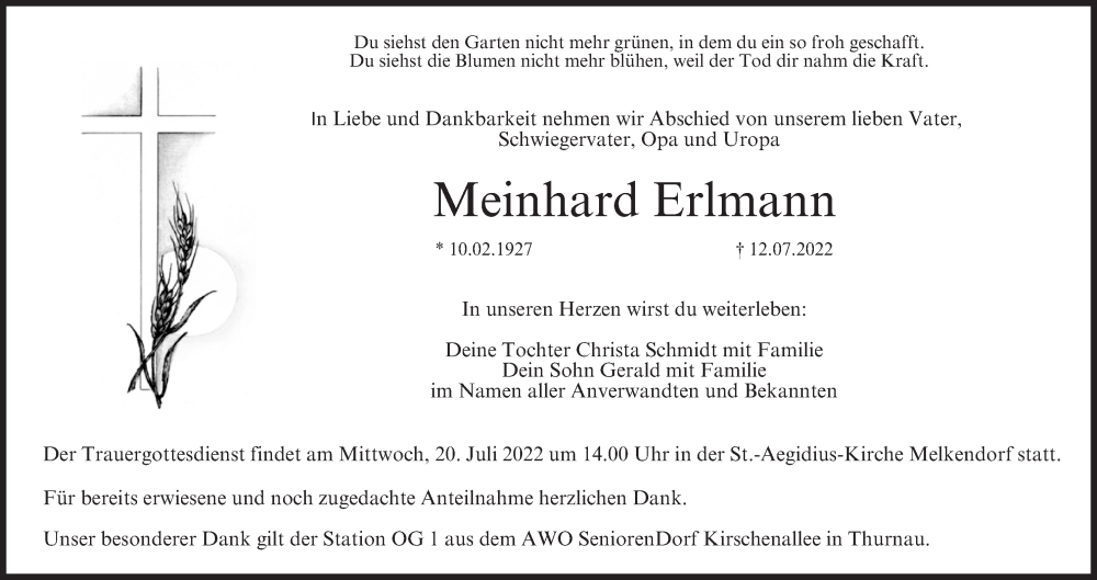 Hier finden Sie alle Traueranzeigen aus der Zeitung, die bisher für Meinhard Erlmann erschienen sind. Weitere Traueranzeigen, die in der Zeitung erscheinen, werden hier ebenfalls aufgelistet