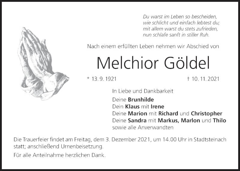 Hier finden Sie alle Traueranzeigen aus der Zeitung, die bisher für Melchior Göldel erschienen sind. Weitere Traueranzeigen, die in der Zeitung erscheinen, werden hier ebenfalls aufgelistet