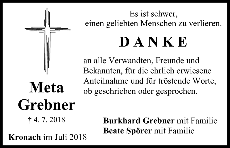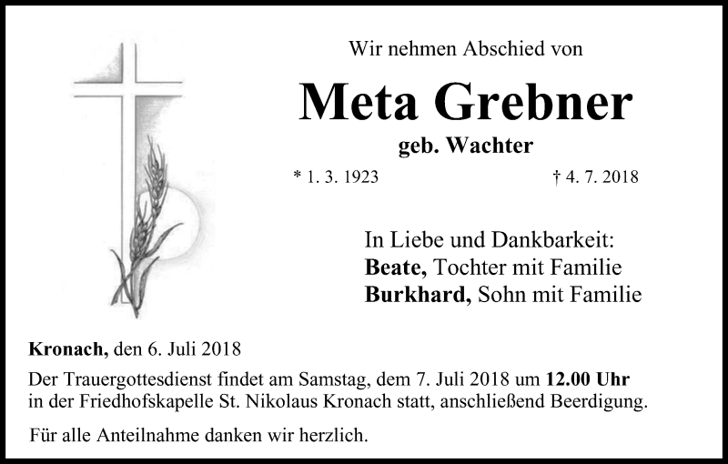 Hier finden Sie alle Traueranzeigen aus der Zeitung, die bisher für Meta Grebner erschienen sind. Weitere Traueranzeigen, die in der Zeitung erscheinen, werden hier ebenfalls aufgelistet