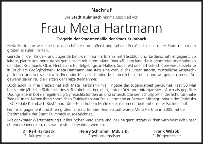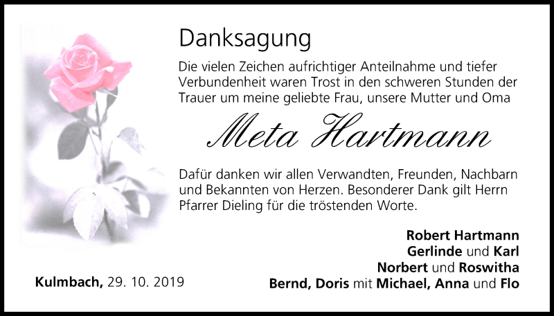Hier finden Sie alle Traueranzeigen aus der Zeitung, die bisher für Meta Hartmann erschienen sind. Weitere Traueranzeigen, die in der Zeitung erscheinen, werden hier ebenfalls aufgelistet