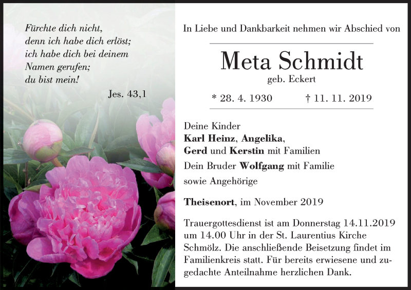 Hier finden Sie alle Traueranzeigen aus der Zeitung, die bisher für Meta Schmidt erschienen sind. Weitere Traueranzeigen, die in der Zeitung erscheinen, werden hier ebenfalls aufgelistet