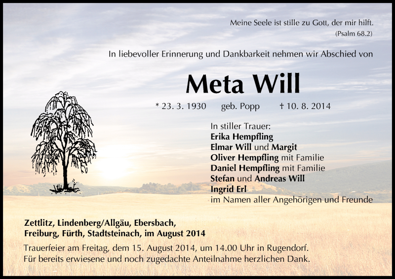 Hier finden Sie alle Traueranzeigen aus der Zeitung, die bisher für Meta Will erschienen sind. Weitere Traueranzeigen, die in der Zeitung erscheinen, werden hier ebenfalls aufgelistet
